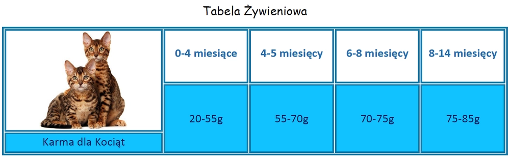 | Wiek kotka | 0 - 4 miesiące | 4 - 6 miesięcy | 6 - 8 miesięcy | 8 - 14 miesięcy |