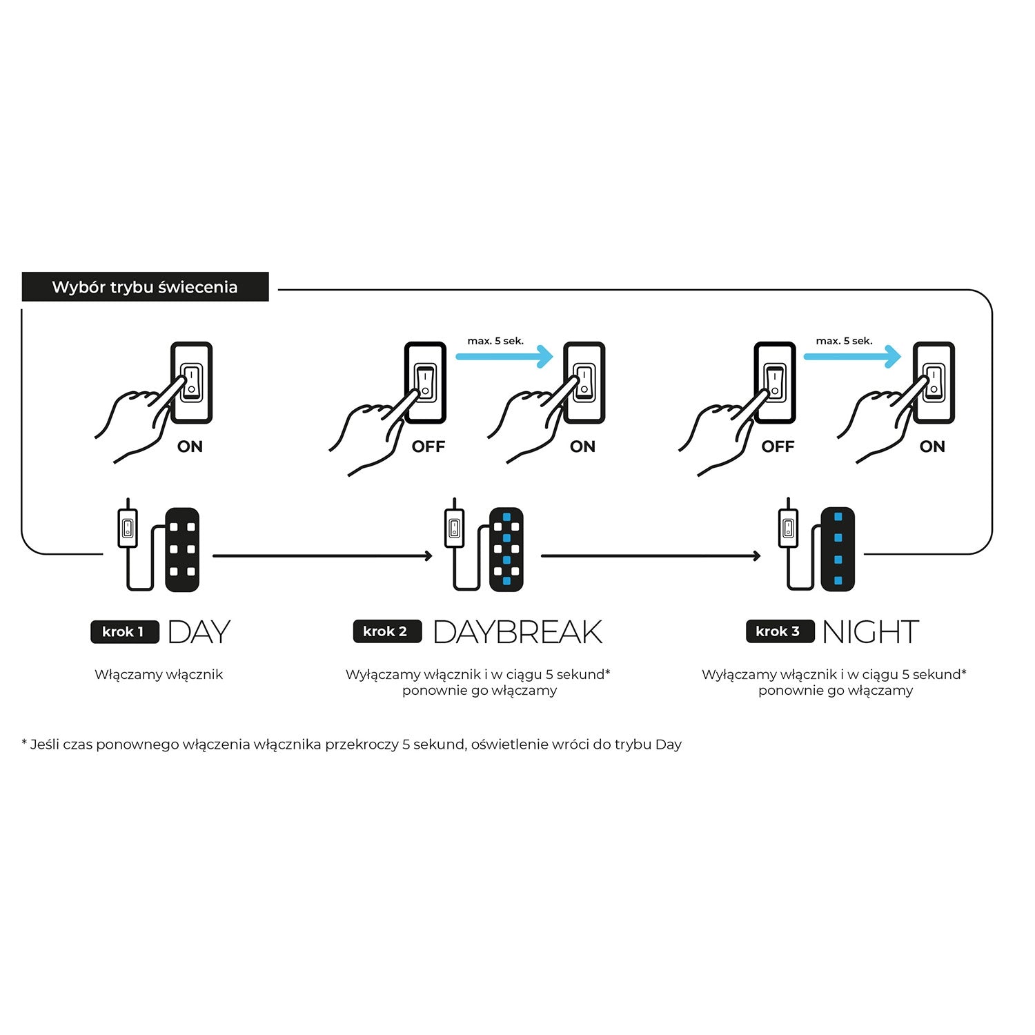 Działa w trzech trybach pracy: DAY / DAYBREAK / NIGHT. DAY to podstawowe i najmocniejsze światło, do oświetlania akwarium w ciągu dnia. DAYBREAK to obniżona moc oświetlenia dziennego do 50% plus światło niebieskie. Sprawdza się jako pierwszy tryb po nocy oraz podczas karmienia ryb – szczególnie w przypadku posiadania płochliwej obsady. NIGHT to niebieska poświata pozwalająca na unikalną obserwację akwarium po zmroku, w tym ryb i zwierząt o nocnym trybie życia.