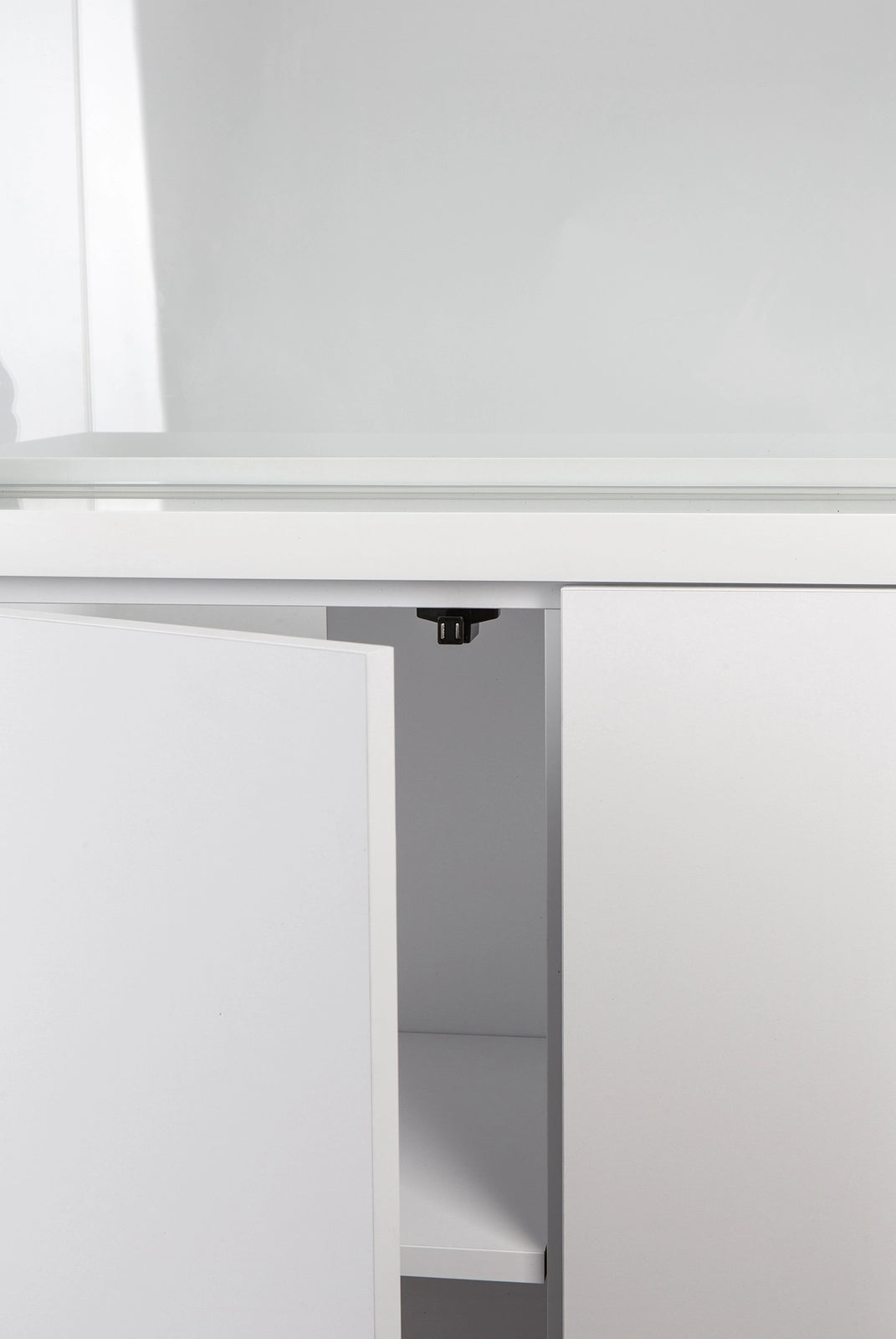 Zlicowanie drzwi szafki z akwarium dodaje elegancji i tworzy wrażenie jednolitej bryły. Z myślą o takim efekcie zastosowano również otwieranie drzwiczek na dotyk, rezygnując z tradycyjnych uchwytów.