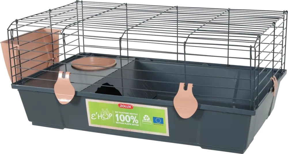 Nowa ekologiczna klatka EHOP dla królika miniaturowego i kawii domowej z podstawą z plastiku pochodzącego w 100% z recyklingu. Za sprawą nowoczesnej kolorystyki wyróżniającej gamę EHOP, z łatwością wpasuje się w domowe wnętrza.